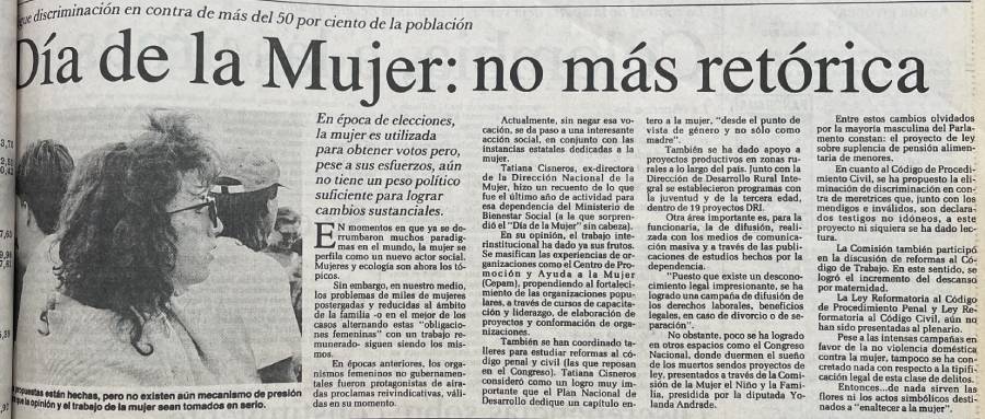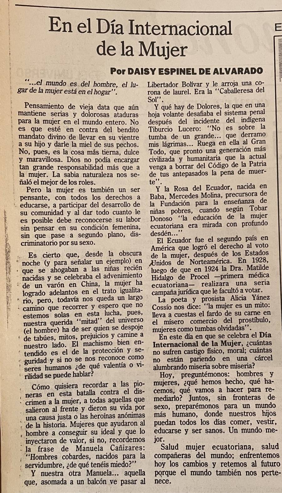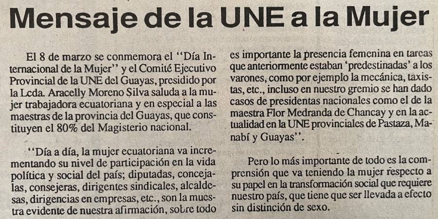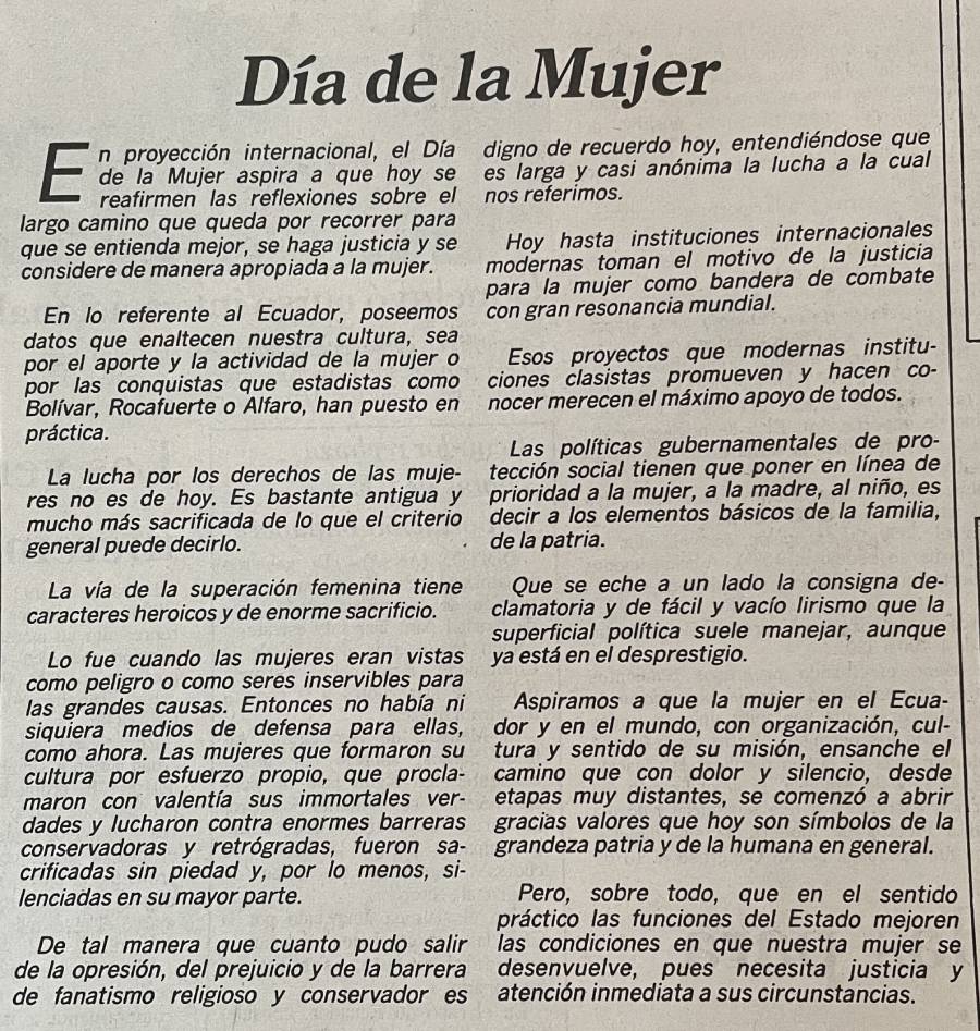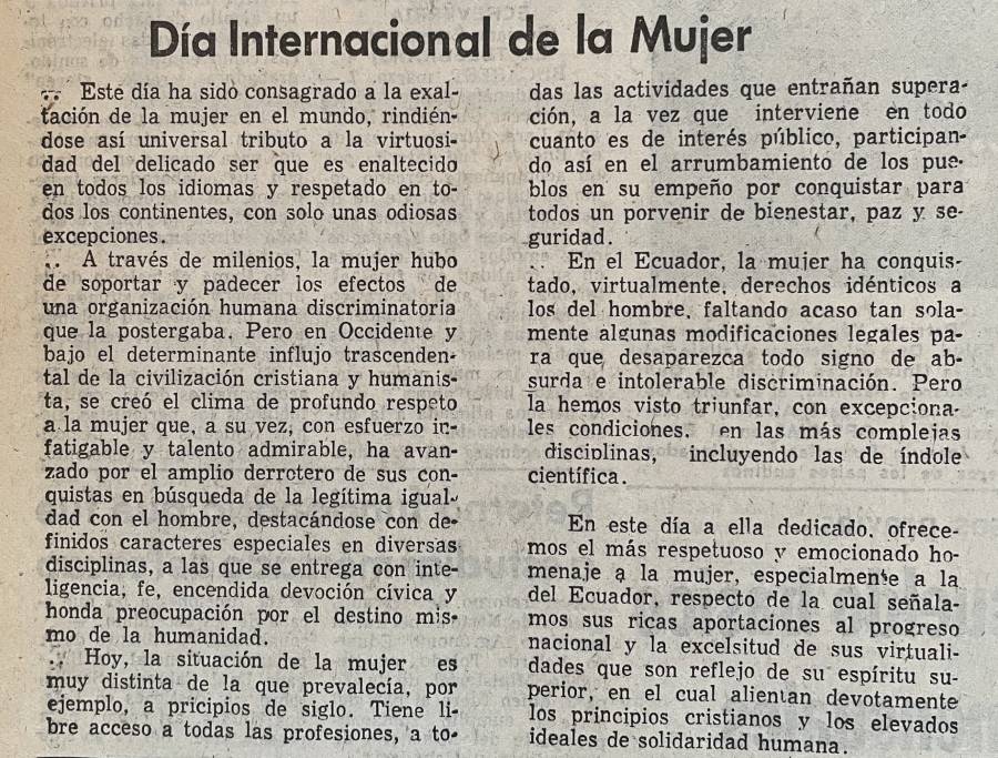 Para entender cómo ha cambiado el enfoque de esta fecha —desde una celebración romántica a un entendimiento de que se trata de una lucha de igualdad de derechos— seleccionamos notas, mensajes, textos y reportajes publicados en los tres periódicos más importantes del país en los últimos 50 años: El Universo, El Comercio y El Telégrafo.